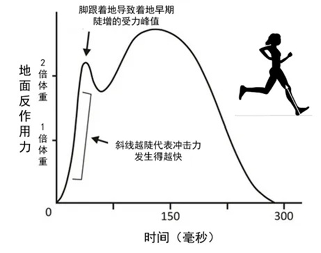 1的曲线描绘出了从脚后跟着地至脚掌离开面过程中地面反作用力的变化,很明显看到有两个峰值。第一个峰值(称为被动峰值)是脚后跟接触地面的瞬间,地面给人体的反作用力(此图是以脚后跟着地跑者的数据),这就是所谓着地冲击力,这个力大约有2-3倍体重,这个冲击力不断积累是导致跑步膝痛的关键原因