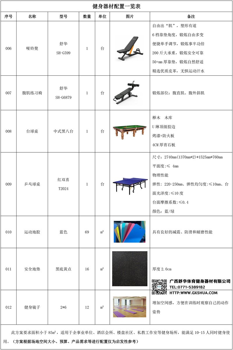 此方案要求面积小于85m²,适用于企事业单位、酒店会所、楼盘社区、私教工作室等健身场所,能满足10-15人同时健身使用(方案根据场地空间大小、预算、产品需求等进行配置仅为启发性参考)