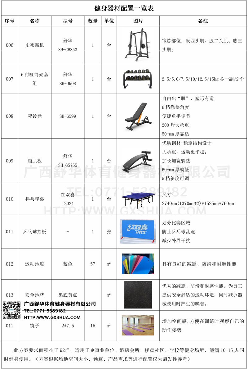 此方案要求面积小于92m²,适用于企事业单位、酒店会所、楼盘社区、学校等健身场所,能满10-15人同时健身使用。(方案根据场地空间大小、预算、产品需求等进行配置仅为启发性参考)