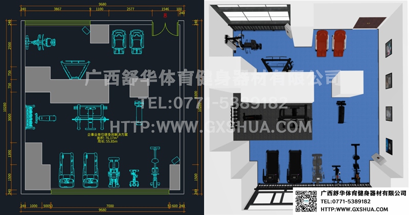 由于企业单位健身房的不规则性,根据场地、职工需求、整体预算,有氧器材区域配置南宫NG28跑步机2台,椭圆机、动感单车、划船器各1台,满足职工的日常有氧训练需求,有效地提升心肺功能;力量器械配置单人站综合训练器、小飞鸟,满足使用者全身锻炼的需求;自由力量区域配置史密斯机、哑铃套组、腹肌板满足多样化训练需求,促使健身训练更丰富,休闲区配置按摩椅,可以促进血液循环,让员工使用按摩椅放松身心,可以能够有效缓解工作压力。