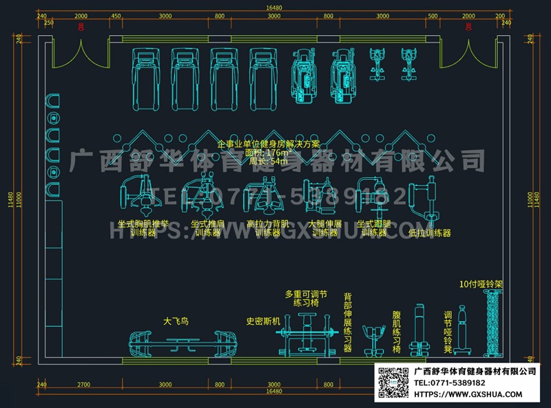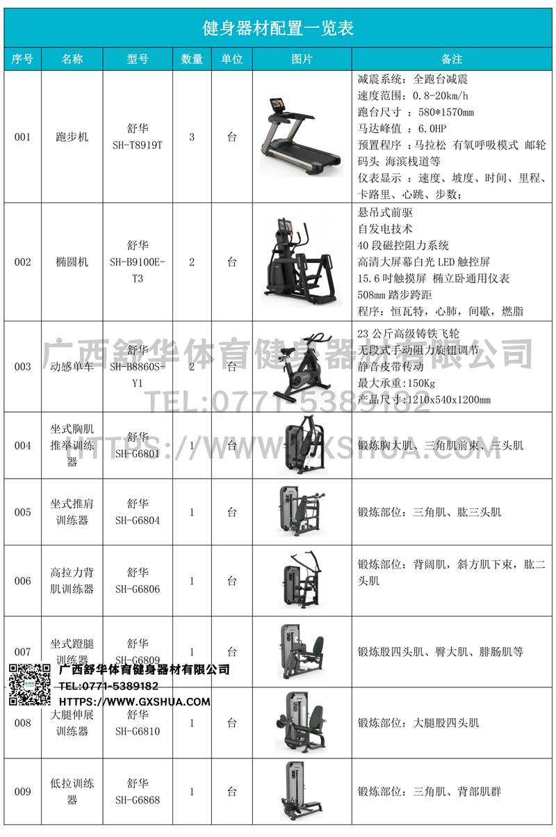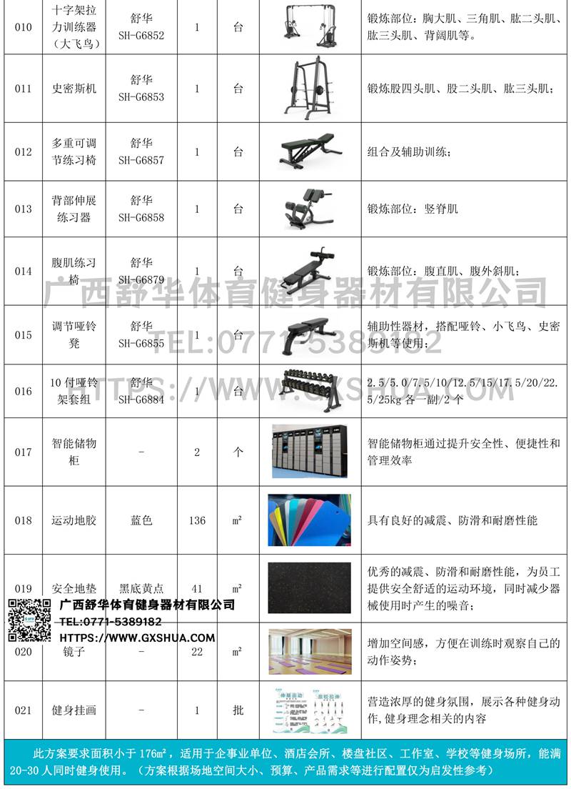 大飞鸟(1台),史密斯机(1台),多重可调节练习椅1台),背部伸展练习器1台),腹肌训练器(1台),10付哑铃套组(1套),可调哑铃凳(1张),可以实现对不同肌肉群的针对性训练,满足肌肉训练需求,全方位激活身体机能。